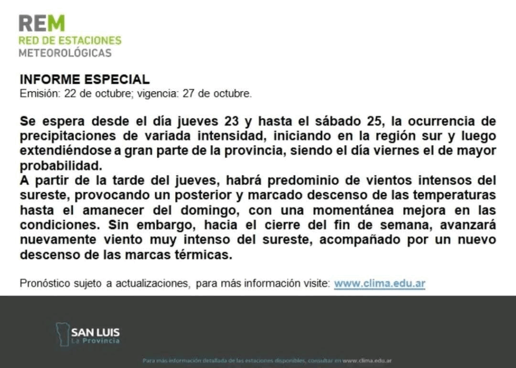 La Red de Estaciones Meteorológicas (REM) de San Luis emitió un informe especial por condiciones climáticas adversas que afectarán a la provincia entre el jueves 23 y el sábado 25 de octubre.