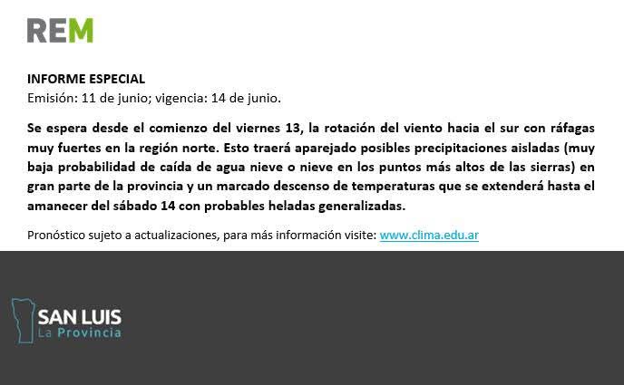 A través de un informe especial, la Red de Estaciones Meteorológicas (REM) indicó que desde el viernes 13 se esperan fuertes vientos del sector sur y descenso de las temperaturas en todo el territorio puntano.