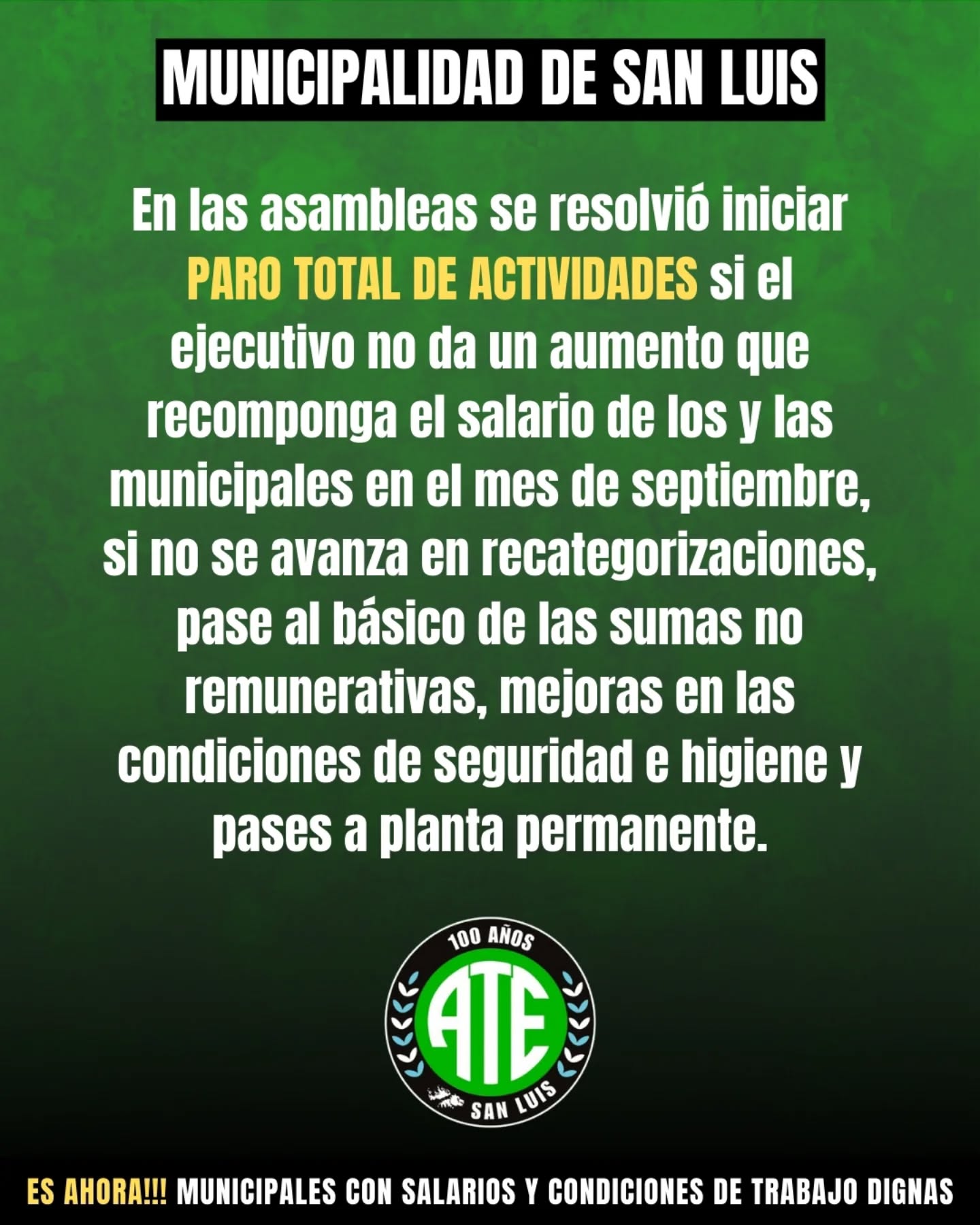 El Consejo Directivo Provincial de la Asociación de Trabajadores del Estado (ATE) San Luis informó que, tras tres días de asambleas y retención de tareas en once sectores de la Municipalidad de San Luis, los trabajadores podrían declarar un paro total de actividades si no obtienen respuestas a su reclamo de recomposición salarial.