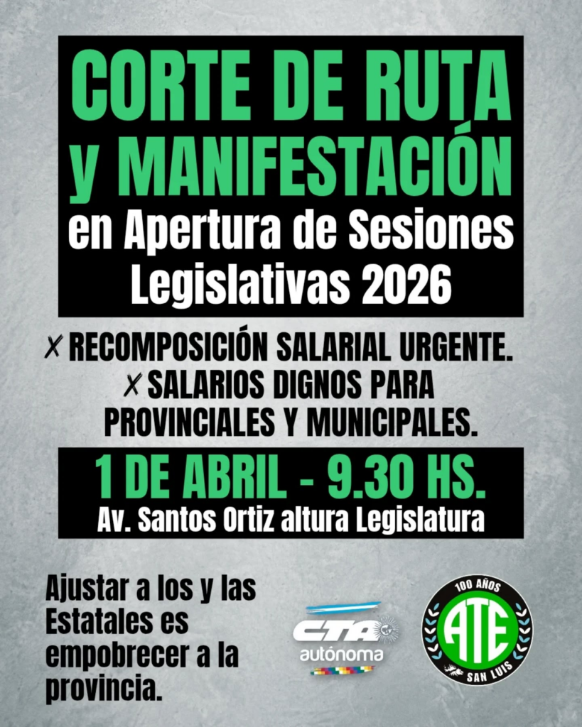 Organizaciones sindicales convocaron a una jornada de protesta con corte de ruta y manifestación para el próximo 1 de abril a las 9:30, en el marco de la apertura de Sesiones Legislativas 2026 en la ciudad de San Luis.
