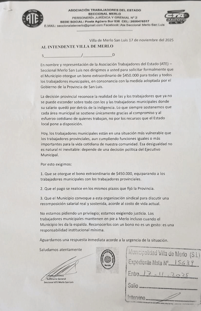 La Asociación de Trabajadores del Estado (ATE) Seccional Merlo informó que presentó un pedido formal al Municipio para que otorgue un bono de fin de año de $450.000 a todas y todos los trabajadores municipales, en concordancia con el beneficio anunciado recientemente por el Gobierno de la Provincia.