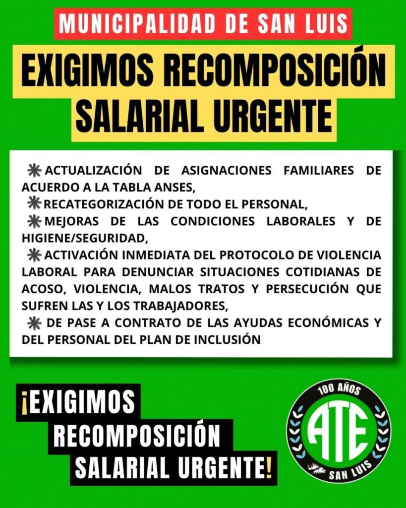 La Asociación de Trabajadores del Estado (ATE) San Luis difundió un comunicado en el que exige una recomposición salarial urgente para el personal de la Municipalidad, junto con una serie de mejoras laborales.