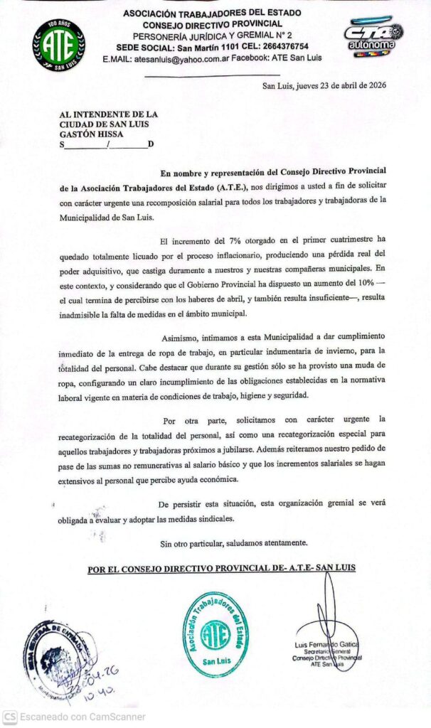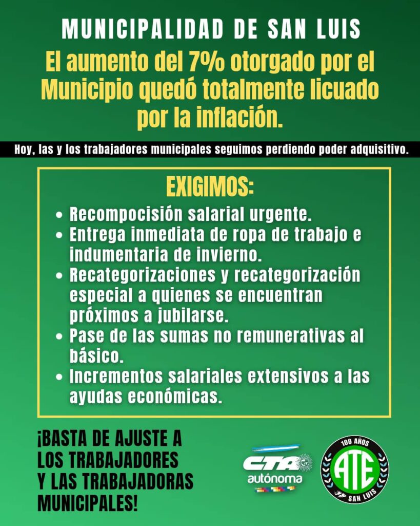 La Asociación Trabajadores del Estado (ATE) de San Luis presentó un reclamo formal ante el intendente Gastón Hissa en el que exige una urgente recomposición salarial para los trabajadores municipales, al advertir que el aumento del 7% otorgado por el Municipio “quedó totalmente licuado por la inflación”.
