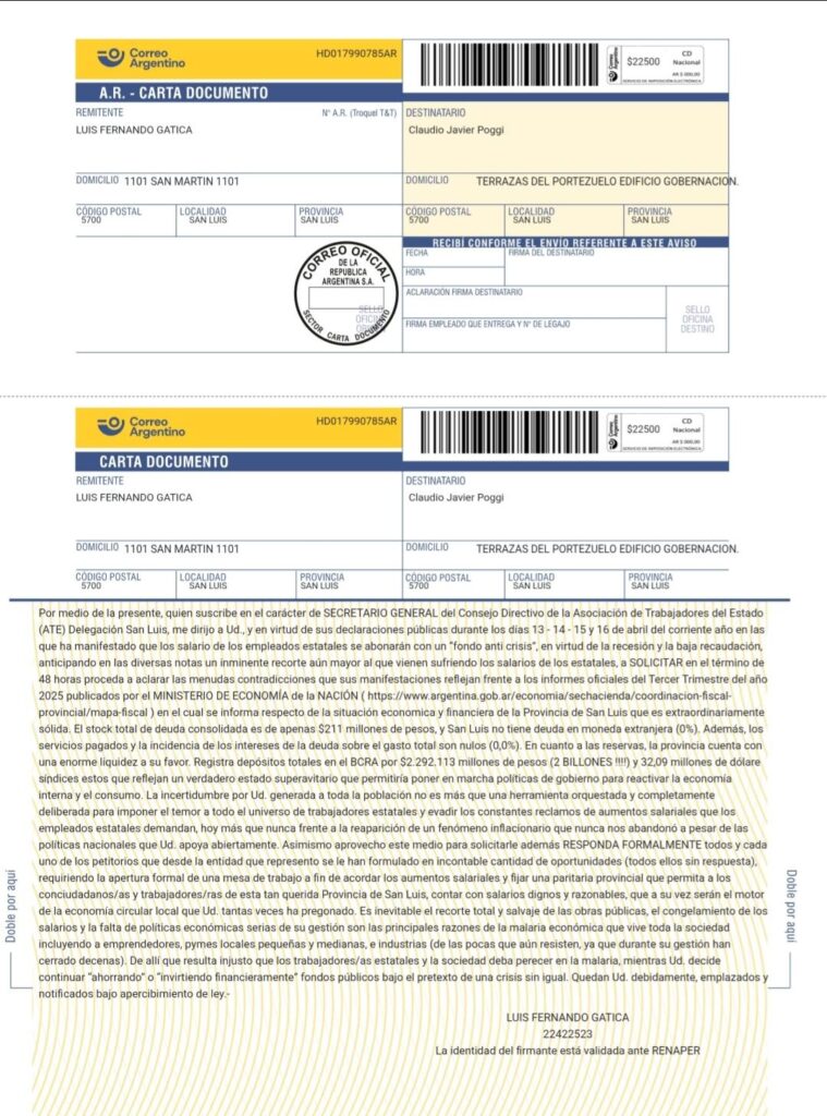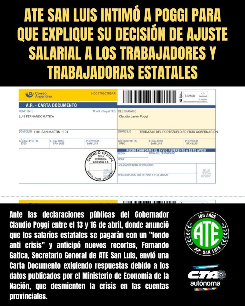 La seccional ATE San Luis intimó al gobernador Claudio Poggi mediante una carta documento para que explique su decisión sobre el ajuste salarial a los trabajadores estatales, tras declaraciones públicas realizadas entre el 13 y el 16 de abril.