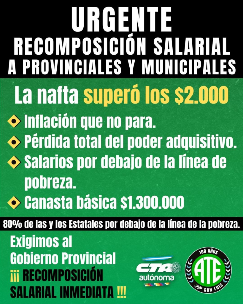 El Consejo Directivo Provincial de la Asociación de Trabajadores del Estado (ATE) San Luis exigió al Gobierno provincial una recomposición salarial inmediata para todos los trabajadores y trabajadoras estatales, y solicitó que se adopten medidas para garantizar también mejoras en los salarios del ámbito municipal.