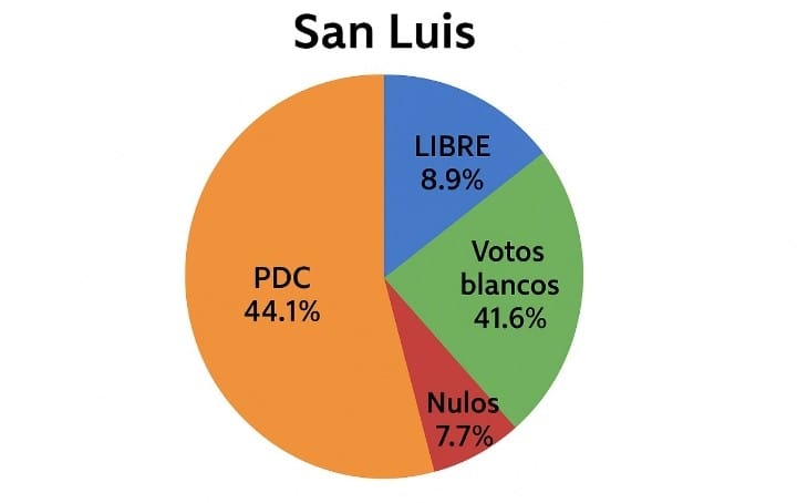 En San Luis, Paz, aliado de Evo Morales, se impuso con el 44,1% de los votos, mientras que su contrincante Quiroga alcanzó solo el 8,9%. Hubo, además, un 41,6% de votos en blanco y un 7,7% de votos nulos.