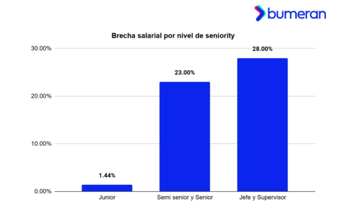 El informe también destaca que la brecha salarial aumenta con el nivel de seniority. En posiciones junior, la diferencia es mínima, con hombres pidiendo un 1,44% más que las mujeres. Sin embargo, en posiciones semi senior y senior, la brecha crece al 23,05%. La mayor disparidad se da en roles de jefe y supervisor, donde los hombres solicitan un 28,51% más que las mujeres.