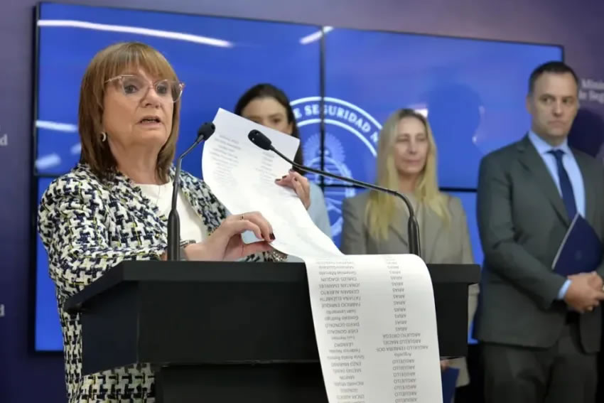 La funcionaria presentó el listado este lunes en una conferencia de prensa y lo entregó simbólicamente a Abigail Dressel, encargada de Negocios de la embajada de Estados Unidos en Argentina. El objetivo es impedir que personas con antecedentes penales o prohibición vigente en el país accedan a los estadios norteamericanos durante el torneo que se jugará del 15 de junio al 13 de julio.