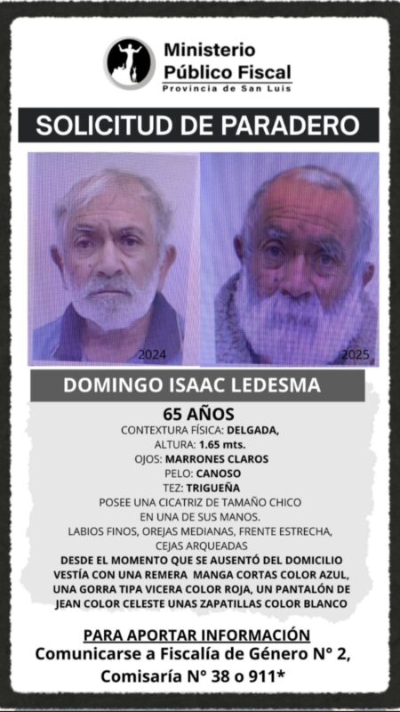 La Fiscalía de Género N°2 difundió este martes un video de Domingo Isaac Ledesma, el hombre que permanece desaparecido desde el 16 de enero. Las imágenes captaron a Ledesma cinco días después de que su familia perdiera contacto con él, mientras caminaba por la zona de avenida Lafinur y Tomás Jofré, en la ciudad de San Luis.