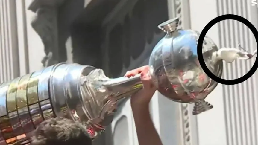 El momento más desopilante llegó cuando la réplica del trofeo se partió en la unión entre la pelota y la figura. Para evitar perderla en pleno festejo, alguien improvisó una reparación con cinta adhesiva. La escena se viralizó de inmediato y se convirtió en uno de los grandes memes del día.