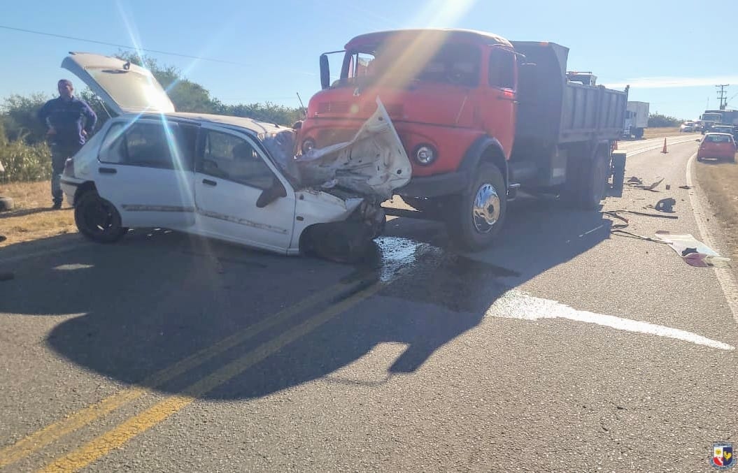 Por causas que aún se investigan, un Renault Clío que circulaba de sur a norte impactó de frente con un camión Mercedes Benz que iba en sentido contrario y remolcaba una máquina.