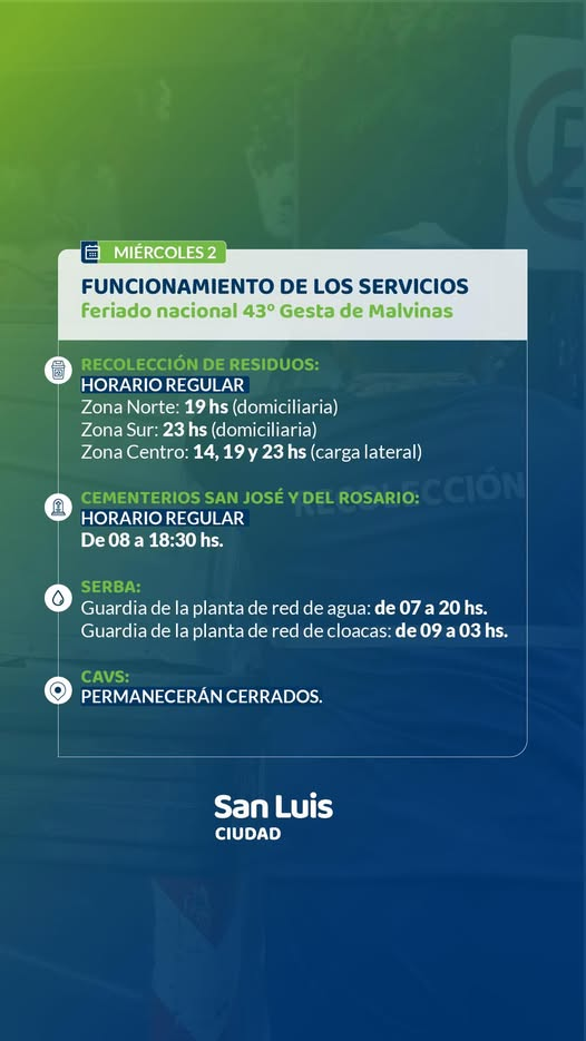 La Municipalidad de la ciudad de San Luis dio a conocer el funcionamiento de los servicios públicos durante este miércoles 2 de abril feriado por el Día de los Veteranos y Caídos en Malvinas.