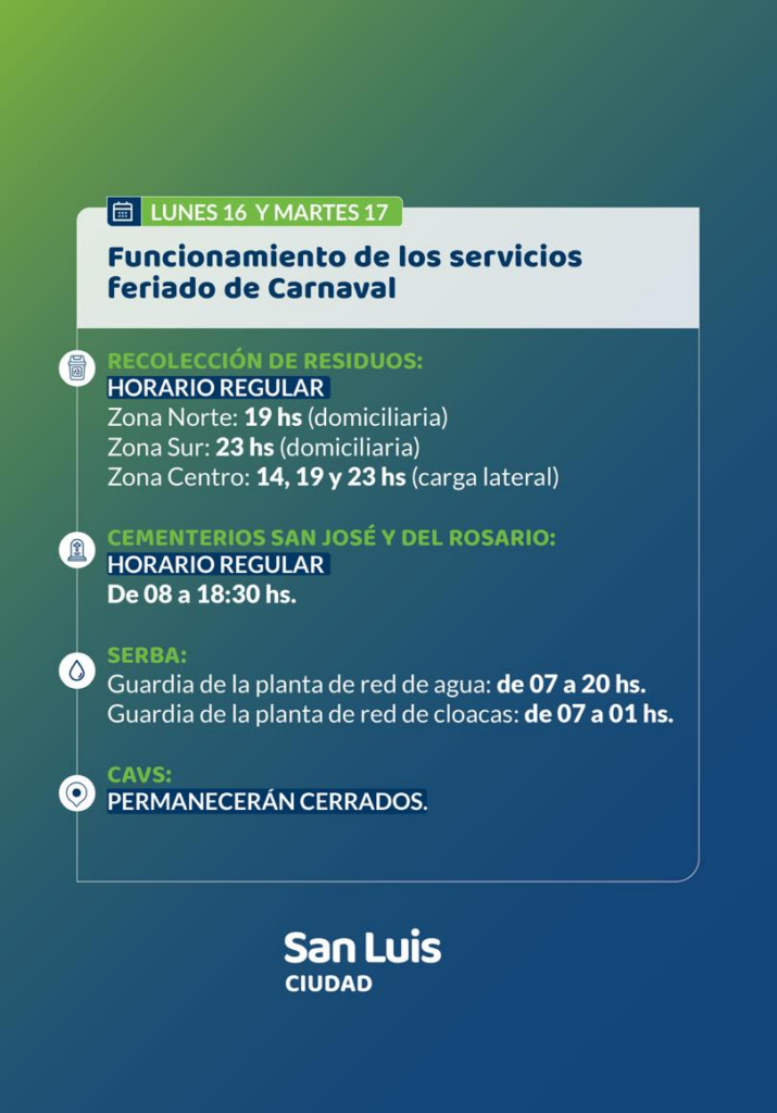 La Municipalidad de San Luis dio a conocer cómo será el esquema de prestación de servicios durante los feriados de Carnaval, correspondientes al lunes 16 y martes 17.