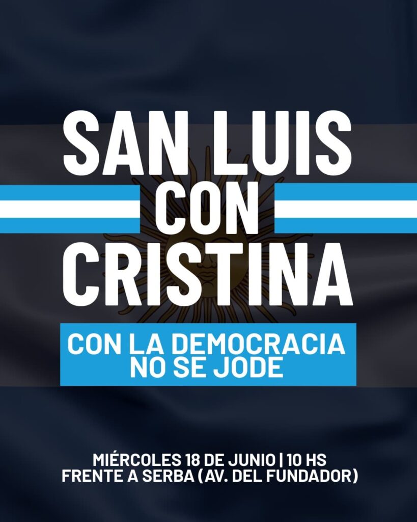 Agrupaciones políticas y sociales, junto a vecinos de la ciudad de San Luis, se concentrarán este miércoles por la mañana en la avenida del Fundador, frente a Ser.Ba. El objetivo es expresar su apoyo a la expresidenta Cristina Fernández de Kirchner.