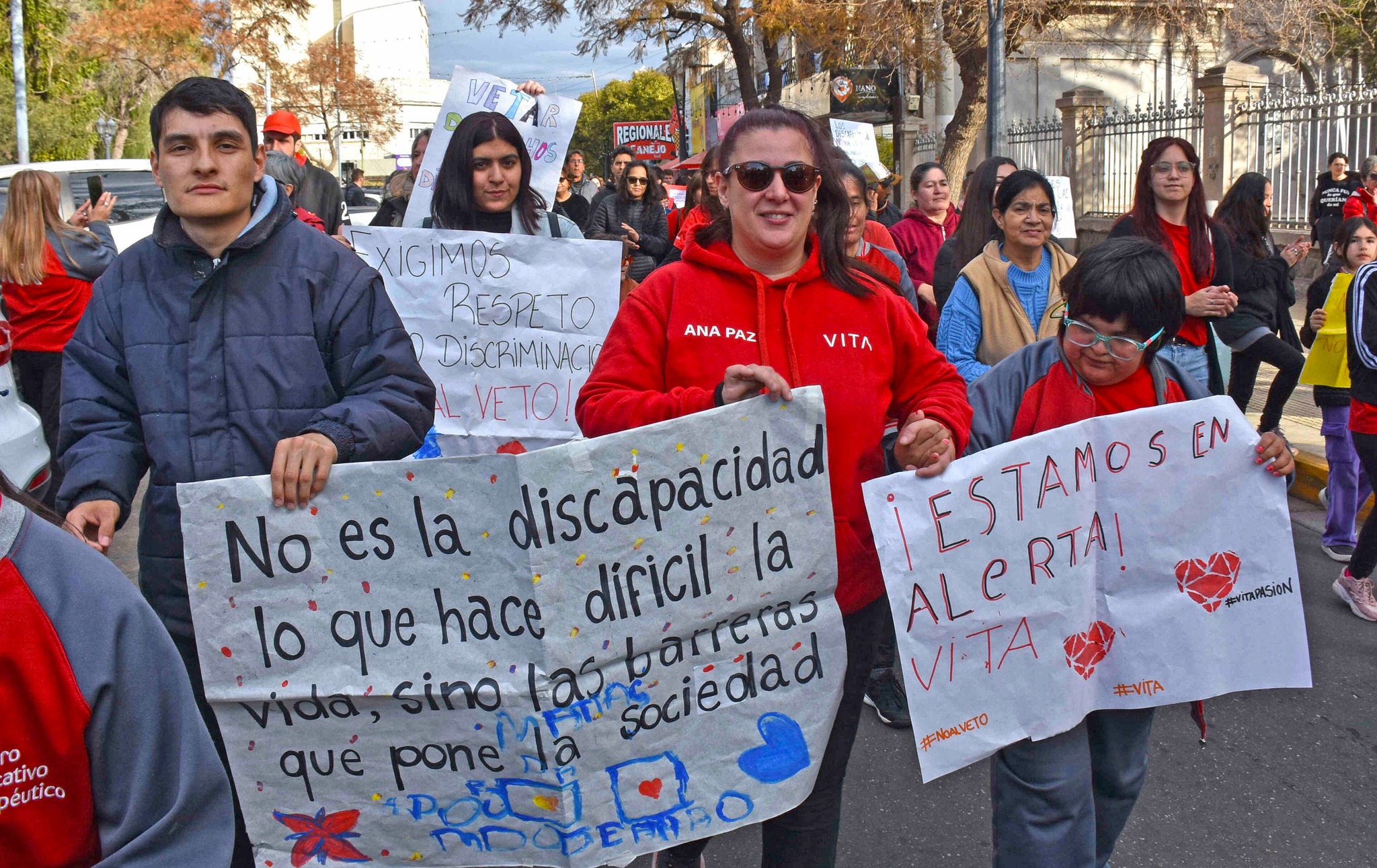 Instituciones, prestadores y familias marcharon por el centro de la ciudad de San Luis para manifestarse contra el veto del presidente Javier Milei a la Ley de Emergencia en Discapacidad, sancionada por el Congreso.