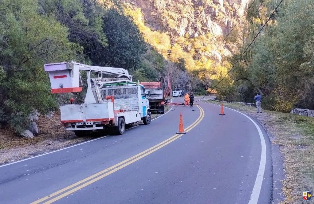 En el lugar del accidente, personal policial reguló y cortó el tránsito, ya que los postes de luz y los cables quedaron tendidos sobre la calzada.