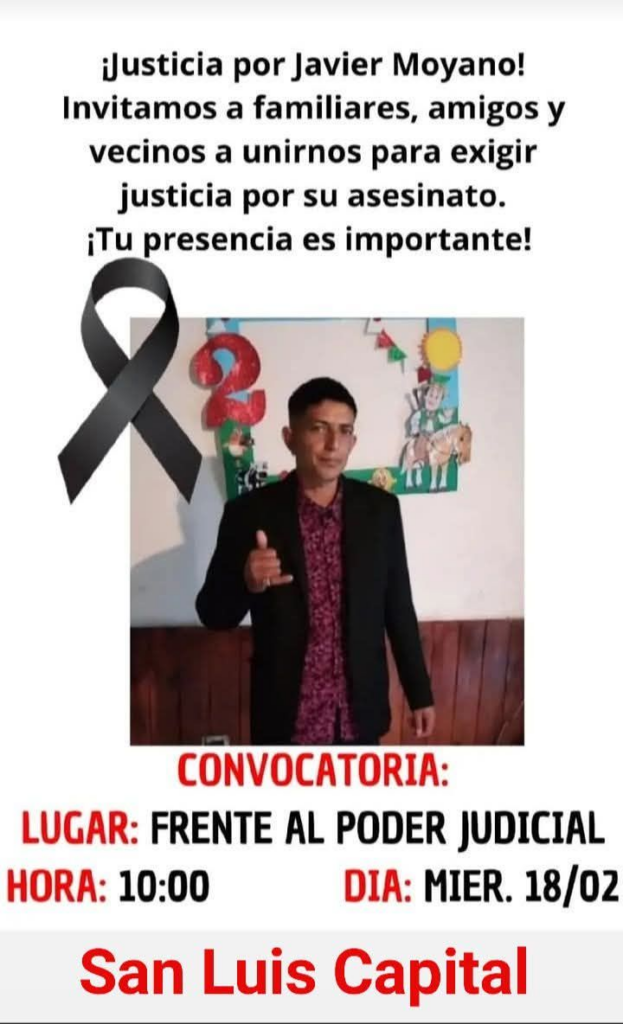 Familiares, amigos y vecinos de Javier Moyano convocan a la comunidad a participar de una movilización para exigir justicia por su asesinato. La concentración será este miércoles 18 de febrero a las 10:00 horas, frente al Poder Judicial de la ciudad de San Luis.