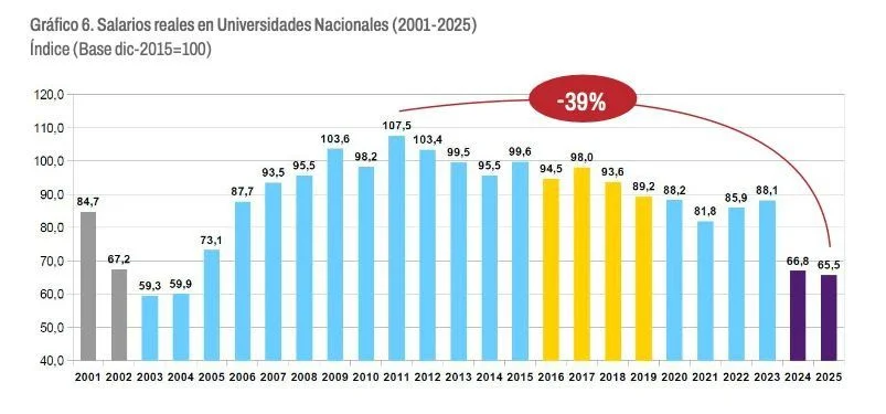 El informe detalla que el presupuesto de las universidades nacionales cayó un 19,8%, mientras que la inversión en ciencia y tecnología retrocedió un 45,4%. Esto afecta directamente al 80% de los investigadores del país, que trabajan en instituciones universitarias.