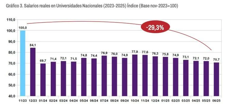 En cuanto a los salarios docentes, la situación es crítica: llevan ocho meses consecutivos de caída y ya perdieron más de un tercio de su valor respecto a noviembre de 2023. Solo en lo que va de 2025, la pérdida alcanza el 7,4%. A largo plazo, la pérdida acumulada supera el 30%, llevando los salarios a niveles por debajo de los registrados en 2002.