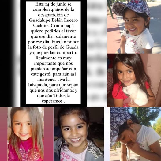 Este sábado 14 de junio se cumplen cuatro años de la desaparición de Guadalupe Belén Lucero Cialone. Por ello, sus familiares directos piden a la sociedad de San Luis que compartan su foto en redes sociales para mantener viva la búsqueda de la pequeña.