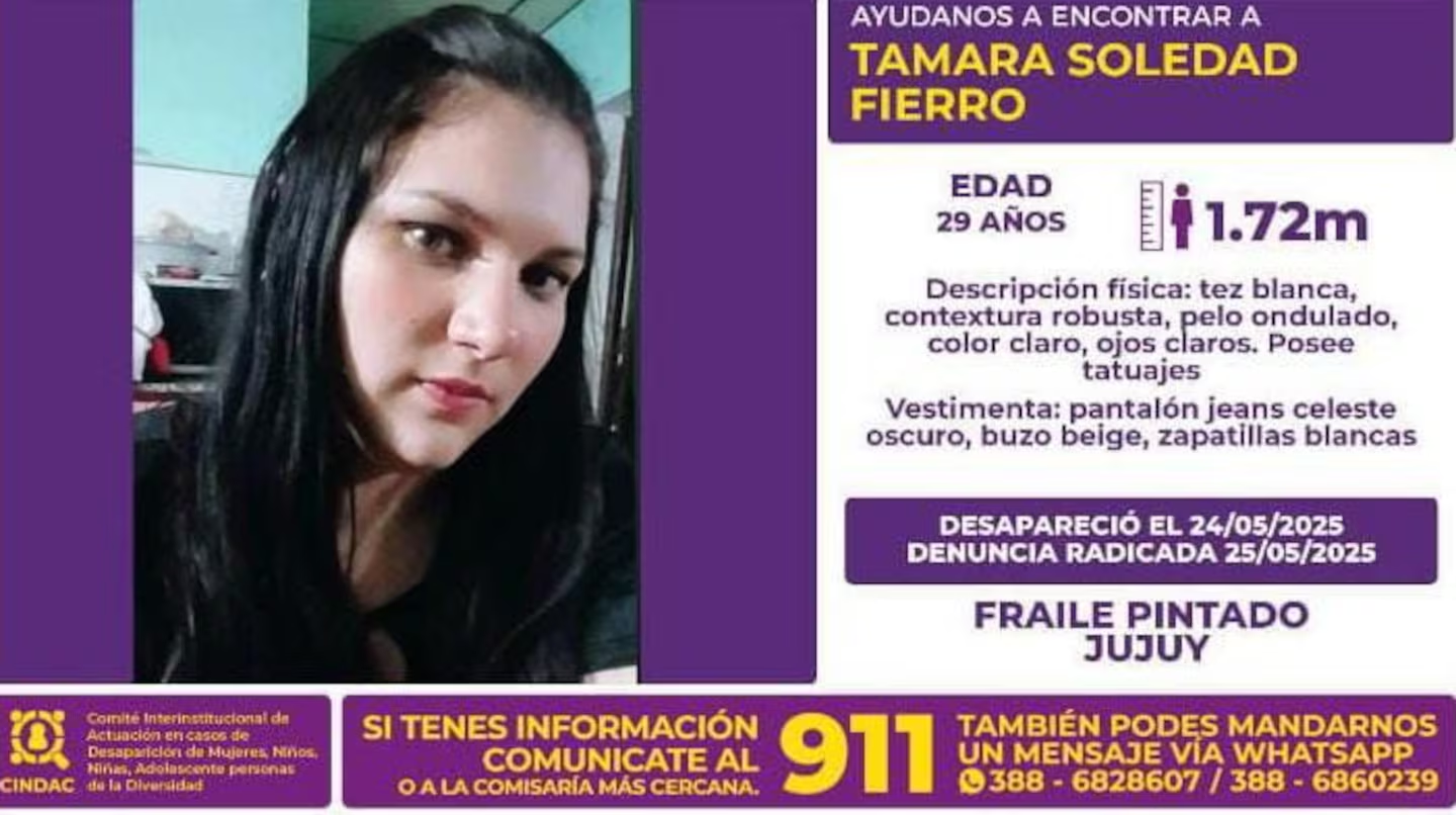 La desaparición de Tamara Fierro mantiene en vilo a la localidad jujeña de Fraile Pintado. La joven fue vista por última vez el sábado 24 de mayo, cuando informó a su familia que asistiría a los eventos por las fiestas patronales. Desde entonces, no regresó a su casa ni volvió a comunicarse.