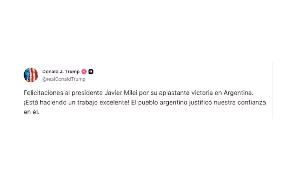 “Felicitaciones al presidente Javier Milei por su aplastante victoria en Argentina. ¡Está haciendo un trabajo excelente! El pueblo argentino justificó nuestra confianza en él”, escribió el líder republicano.