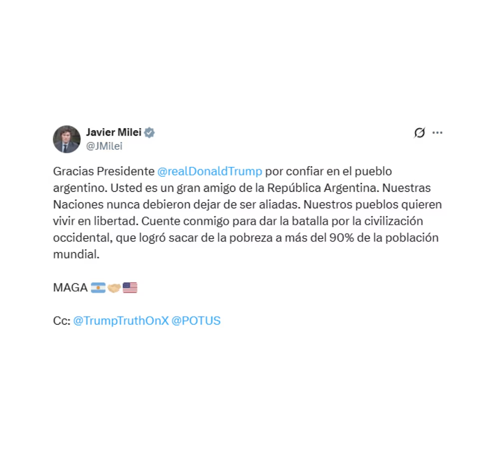 “Gracias Presidente Donald Trump por confiar en el pueblo argentino. Usted es un gran amigo de la República Argentina. Nuestros pueblos quieren vivir en libertad. Cuente conmigo para dar la batalla por la civilización occidental”.