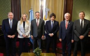 Además del presidente Javier Milei, la declaración fue firmada por sus pares de Bolivia, Luis Arce; de Brasil, Lula da Silva; de Paraguay, Santiago Peña; de Uruguay, Yamandú Orsi; de Panamá, José Raúl Mulino; a los que se sumaron la vicepresidenta de Ecuador, María José Pinto y de autoridades de Colombia, Chile y Perú.