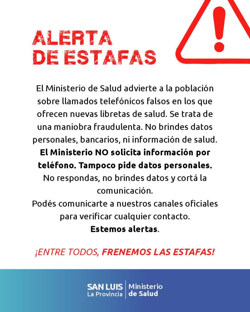 El Ministerio de Salud de San Luis alertó a la población por llamados telefónicos fraudulentos en los que personas ofrecen supuestas nuevas libretas sanitarias para obtener información privada.