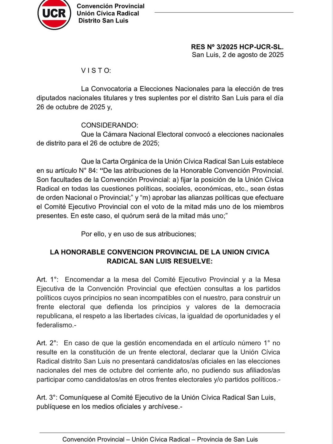 La resolución establece que, si no se constituye una alianza electoral, la UCR distrito San Luis no presentará candidatos oficiales en las elecciones nacionales. Además, sus afiliados no podrán participar como candidatos en otros frentes o partidos políticos, lo que limita cualquier participación extrapartidaria.