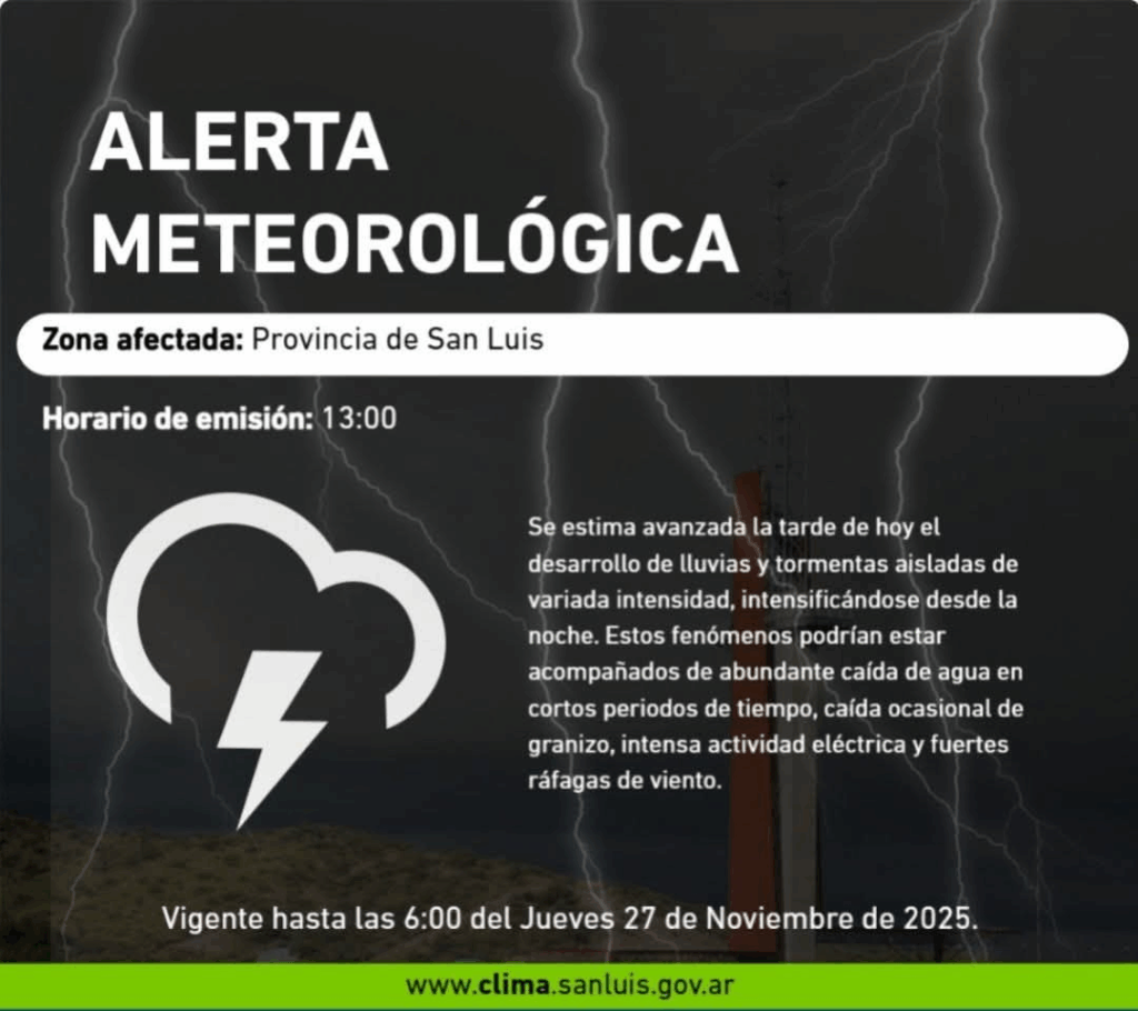La Red de Estaciones Meteorológicas emitió este miércoles a las 13:00 una alerta meteorológica que abarca a toda la provincia de San Luis, ante la probabilidad de que se desarrollen lluvias y tormentas aisladas de variada intensidad durante la tarde, con una posible intensificación hacia la noche.