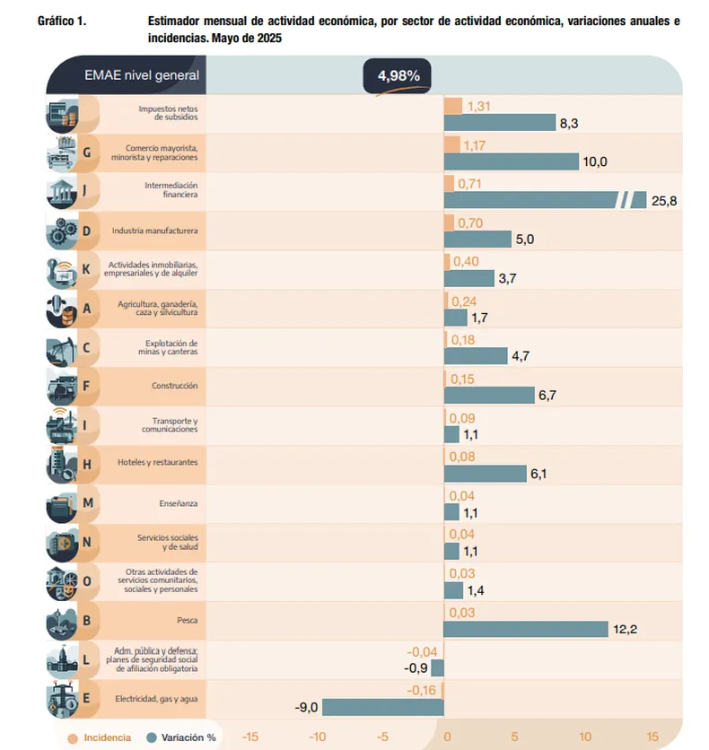 En la comparación interanual, el EMAE mostró una suba del 5% frente a mayo de 2024, mes en el que el índice sufrió una abrupta caída por la devaluación impulsada por el Gobierno de Javier Milei en los primeros meses de gestión.