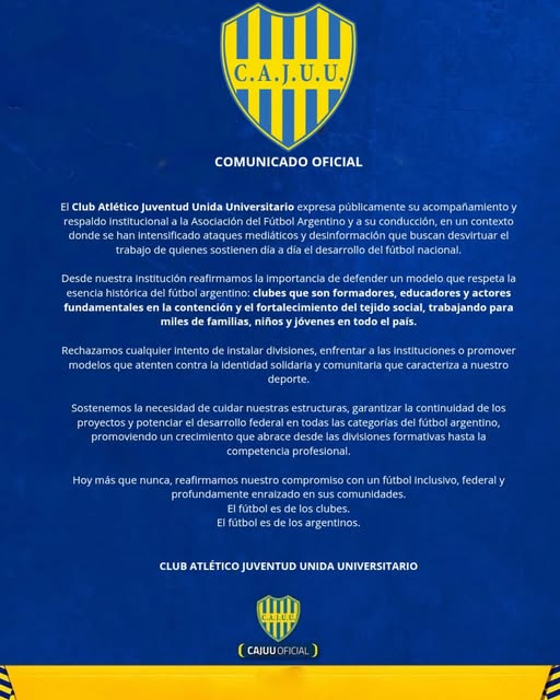 El primero en pronunciarse fue Juventud Unida. A través de un comunicado difundido anoche, la institución remarcó que en los últimos días se multiplicaron “ataques mediáticos y operaciones que intentan distorsionar la realidad del fútbol argentino”.