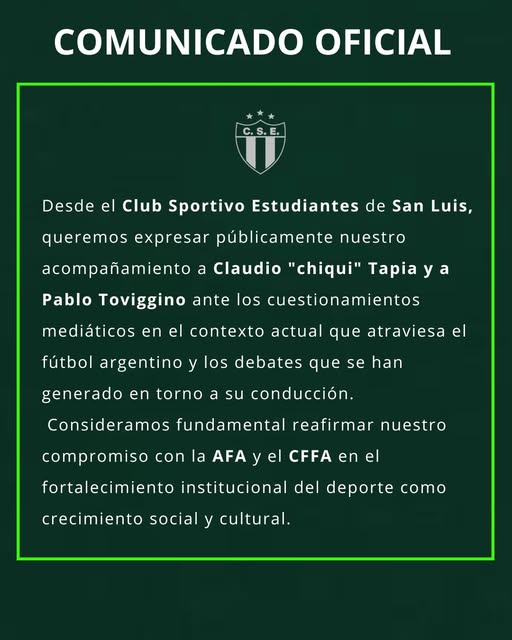 Horas después, Estudiantes de San Luis también fijó postura. El “Albiverde” publicó un comunicado propio en sus redes sociales donde expresó su “acompañamiento institucional” a la AFA y subrayó la necesidad de preservar el federalismo deportivo, un punto que, consideraron, “queda en riesgo cuando se buscan instalar modelos ajenos a la tradición del fútbol argentino”.