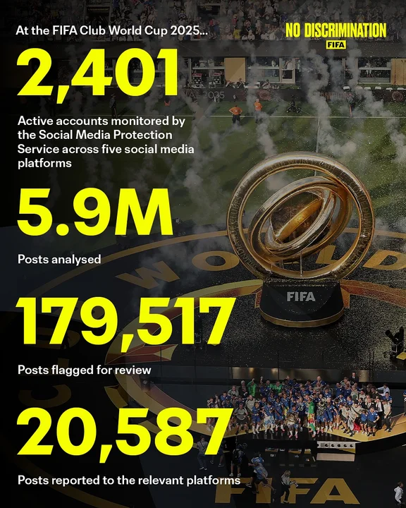 El sistema estuvo operativo en certámenes recientes, entre ellos el Mundial de Clubes FIFA™ 2025, disputado en Estados Unidos. Allí se monitorearon 2.401 cuentas en cinco plataformas distintas, vinculadas a jugadores, entrenadores, equipos y árbitros. En total se analizaron 5,9 millones de publicaciones, de las cuales 179.517 fueron marcadas para revisión y 20.587 denunciadas formalmente.