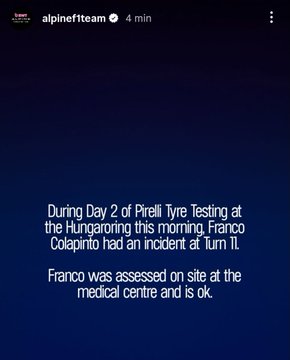El accidente generó preocupación entre los fanáticos y el paddock de la Fórmula 1, especialmente tras el complicado fin de semana que Alpine tuvo en el GP de Hungría, donde Colapinto terminó 18.° tras múltiples errores en boxes y estrategia.