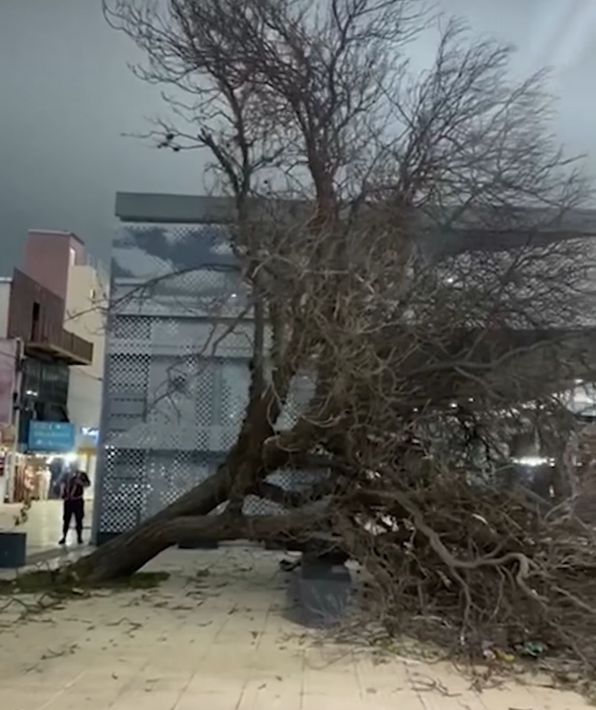 Árbol caído y vidrieras rotas en el centro