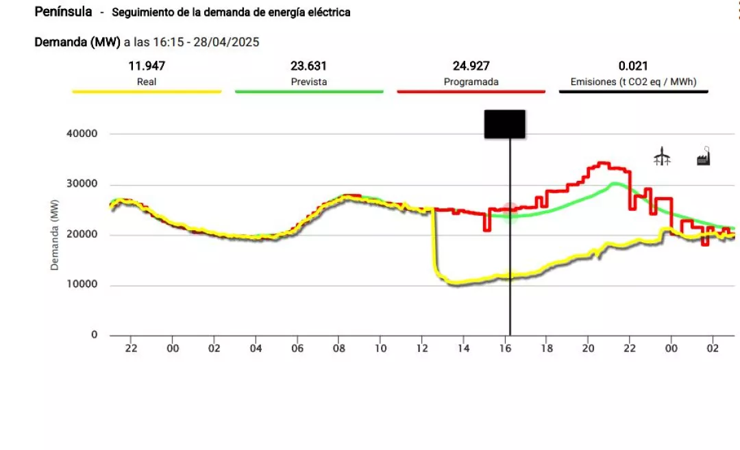 - Demanda eléctrica afectada: caída de 27.500 MW a 15.000 MW en España