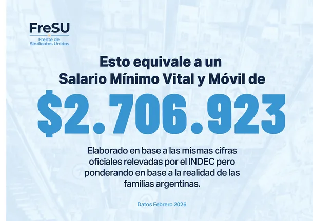 En un desafío directo a las mediciones oficiales, el Frente de Sindicatos Unidos (FreSU) —ATE, UOM, Aceiteros y Aeronáuticos— presentó la «Canasta Básica del Hogar Trabajador». El informe determinó que un asalariado necesita $2.706.923 para una vida digna, una cifra que expone la enorme brecha respecto a los datos del INDEC.