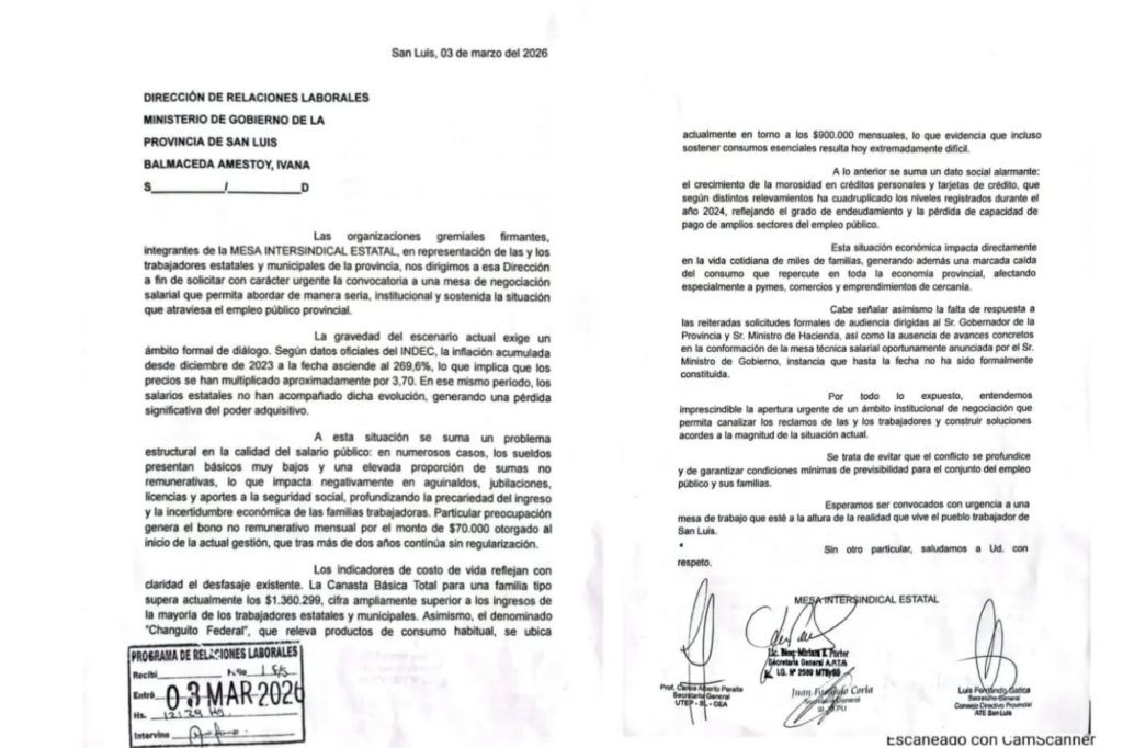La Mesa Intersindical Estatal solicitó al Ministerio de Gobierno de la Provincia la apertura “urgente” de una mesa de negociación salarial para abordar la situación del empleo público en San Luis, en el marco del fuerte deterioro del poder adquisitivo y el incremento del costo de vida.