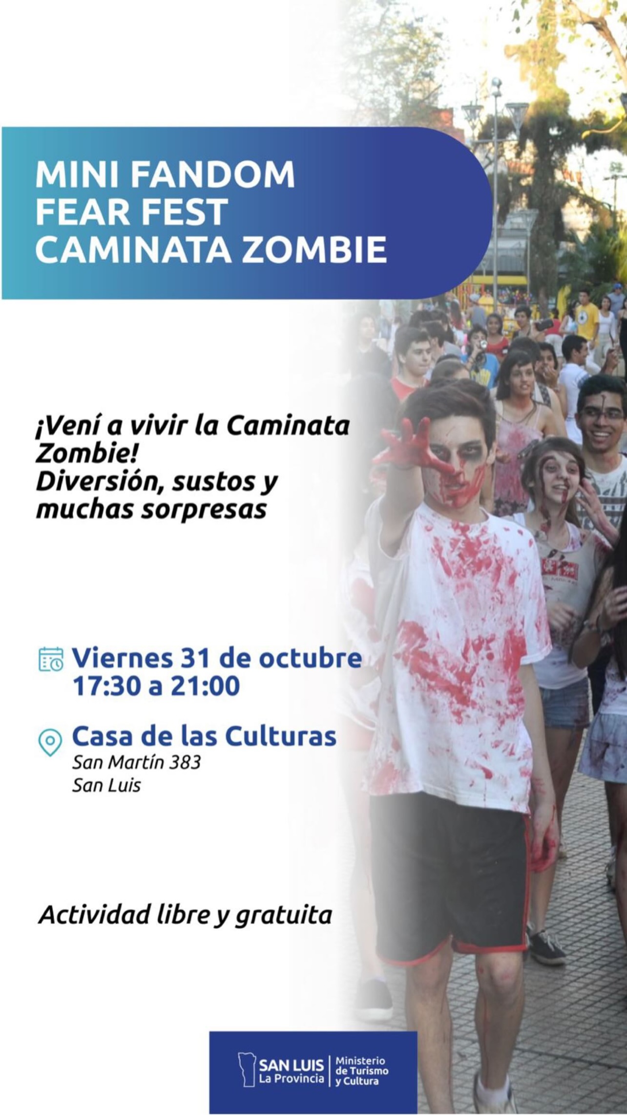 El Ministerio de Turismo y Cultura de San Luis organizó una actividad especial para celebrar Halloween este viernes 31 de octubre. Se trata de la “Mini Fandom Fear Fest”, una propuesta libre y gratuita que incluye una caminata zombie por el centro de la ciudad.