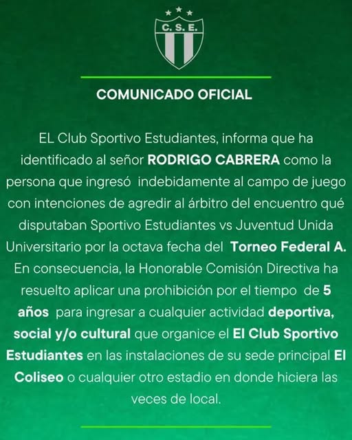 El Club Sportivo Estudiantes de San Luis emitió un comunicado oficial en el que anunció una fuerte sanción contra el hincha identificado como Rodrigo Cabrera, quien ingresó al campo de juego con intenciones de agredir al árbitro durante el clásico puntano ante Juventud Unida Universitario por la octava fecha del Torneo Federal A.