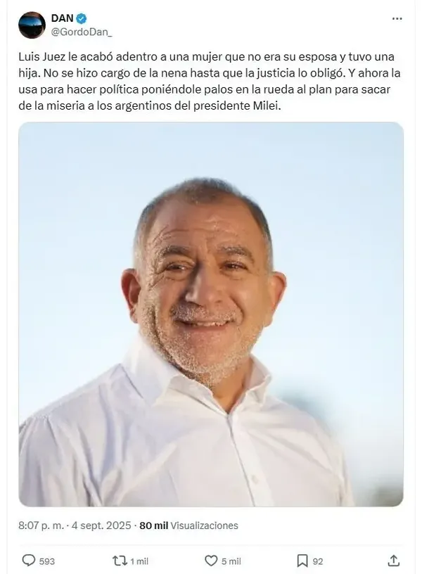 El posteo de Gordo Dan fue cuestionado también desde el propio Gobierno. Minutos después de la publicación, el jefe de Gabinete, Guillermo Francos, lo calificó de “inaceptable” y afirmó que el presidente Milei “seguramente estará en desacuerdo”.