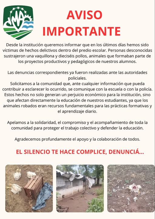 Según detallaron los directivos del establecimiento, los ladrones sustrajeron una vaquillona de aproximadamente 250 kilos y al menos 16 pollos. “Los animales formaban parte de proyectos productivos y pedagógicos de nuestros estudiantes”, lamentaron desde la institución.