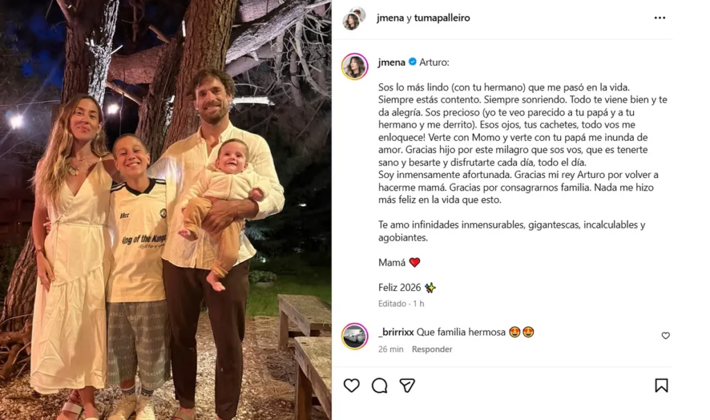 Y cerró: «Soy inmensamente afortunada. Gracias mi rey Arturo por volver a hacerme mamá. Gracias por consagrarnos familia. Nada me hizo más feliz en la vida que esto. Te amo infinidades inmensurables, gigantescas, incalculables y agobiantes. Mamá. Feliz 2026».