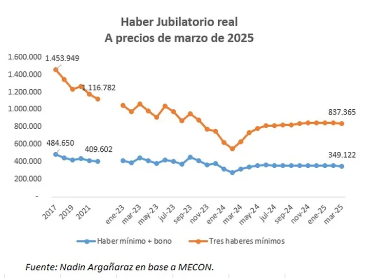 Según el IARAF, el poder adquisitivo de las jubilaciones ha tenido una caída estructural desde 2017. El piso se alcanzó en febrero de 2024, cuando los haberes reales estaban 62% por debajo del promedio de ese año. A pesar de una leve recuperación, en marzo de 2025 aún están un 42% por debajo.