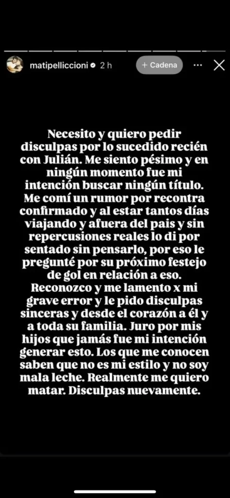 “Me comí un rumor por recontra confirmado y lo di por sentado sin pensarlo. Le pido disculpas sinceras y desde el corazón a él y a toda su familia. Juro por mis hijos que jamás fue mi intención generar esto”.
