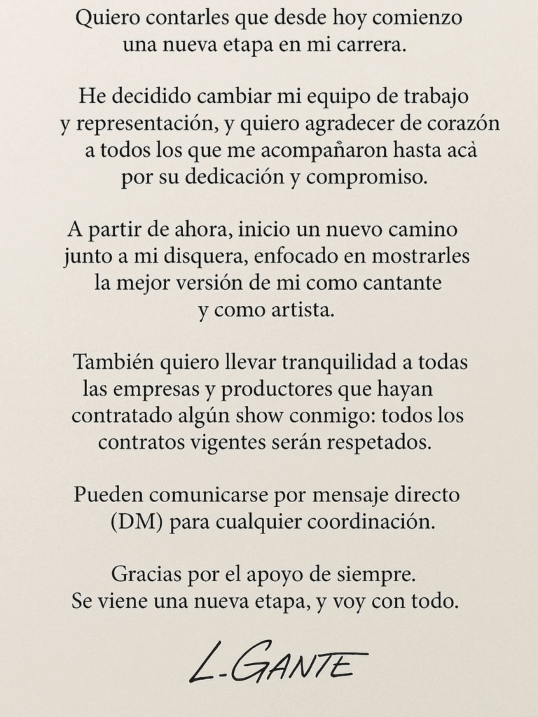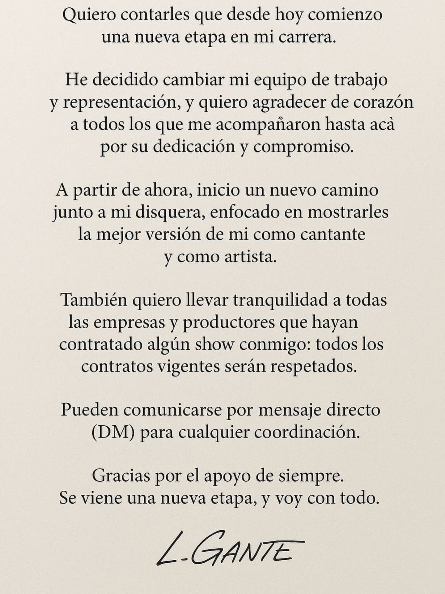 Aunque ninguno de los dos hizo declaraciones públicas más allá del comunicado, la separación marca el final de una etapa clave en la carrera del cantante, quien junto a su representante logró posicionarse como una de las figuras más populares del género urbano en Argentina.Los compromisos de L-Gante siguen en pie