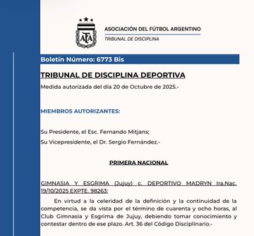 “En virtud a la celeridad de la definición y la continuidad de la competencia, se da vista por el término de cuarenta y ocho horas al Club Gimnasia y Esgrima de Jujuy, debiendo tomar conocimiento y contestar dentro de ese plazo”, expresa el documento oficial.