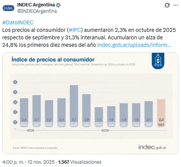 De acuerdo a lo revelado por el Instituto Nacional de Estadística y Censos (INDEC), la inflación del mes de octubre fue del 2,3% y, de esta manera, acumula un 24,8% en lo que va del año, en tanto que el Índice de Precios al Consumidor (IPC) interanual es de 31,3%.